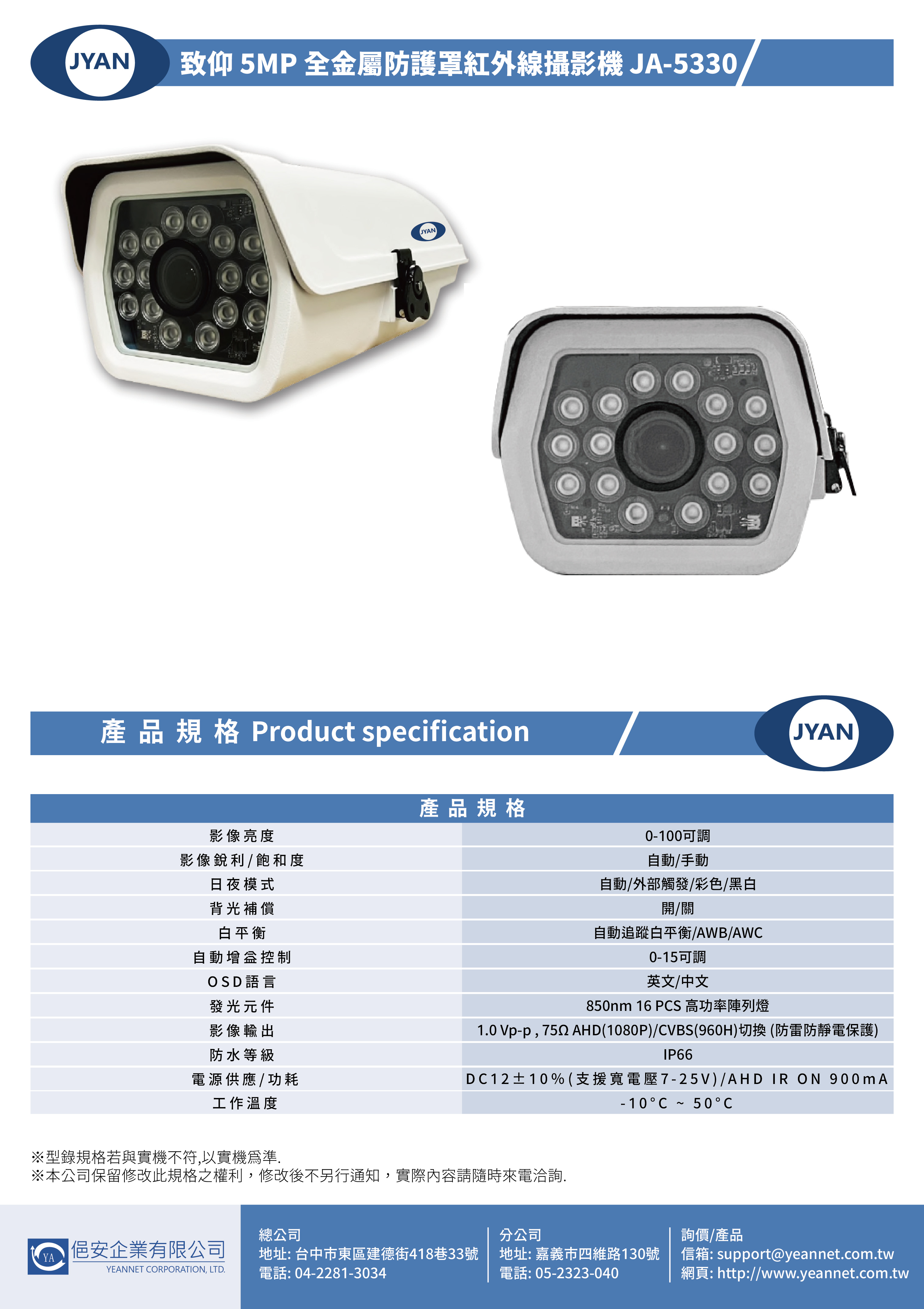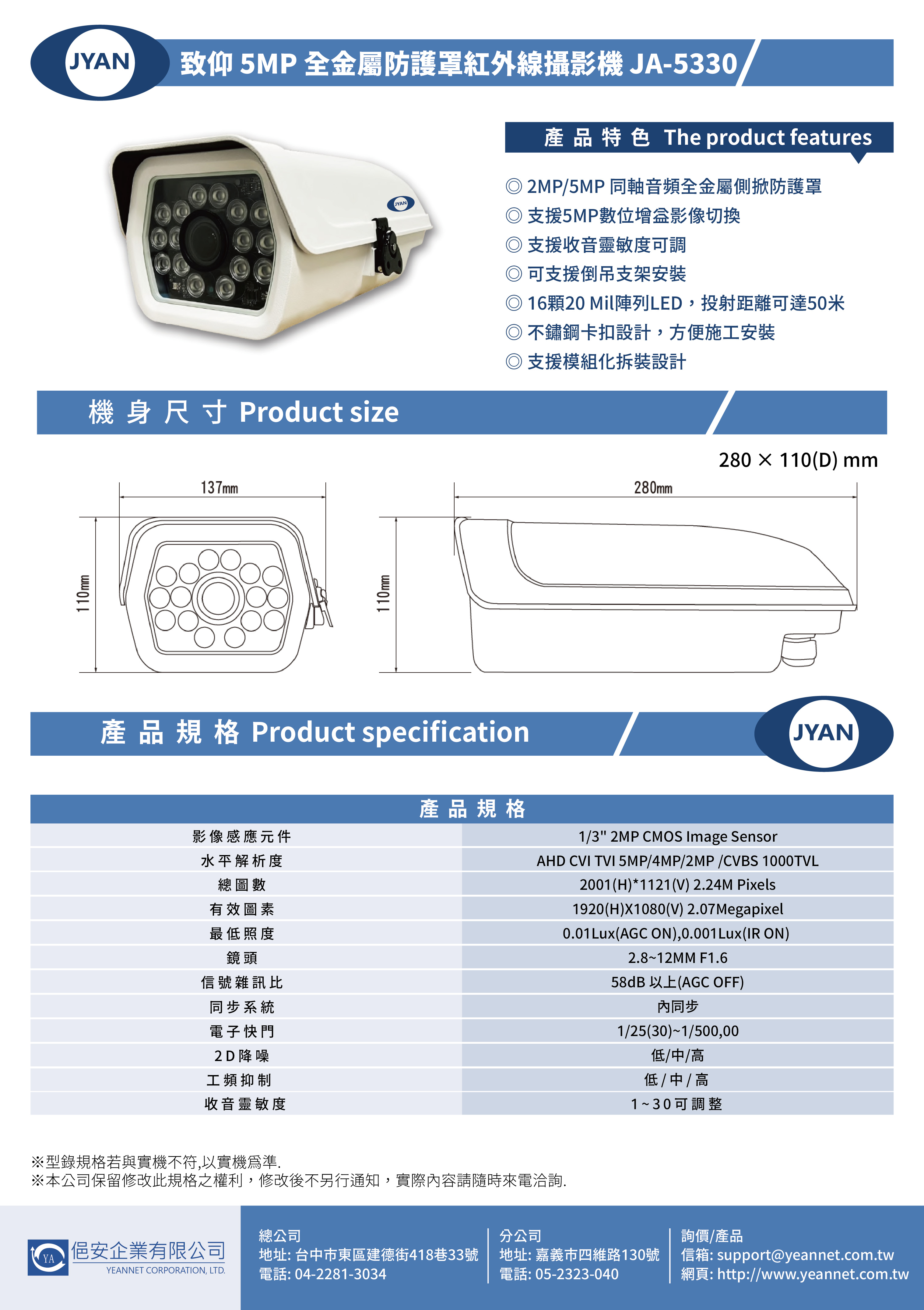 JYAN 致仰 500萬 四合一 變焦防護罩型紅外線同軸音頻攝影機 2.8-12mm JA-5330