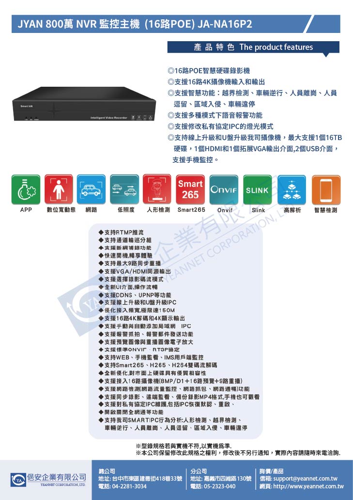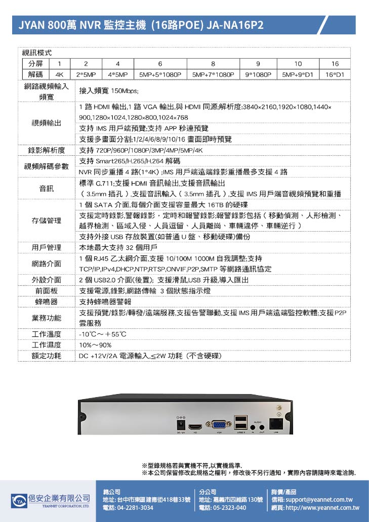 JYAN 800萬 NVR 監控主機 (16路POE) JA-NA16P2