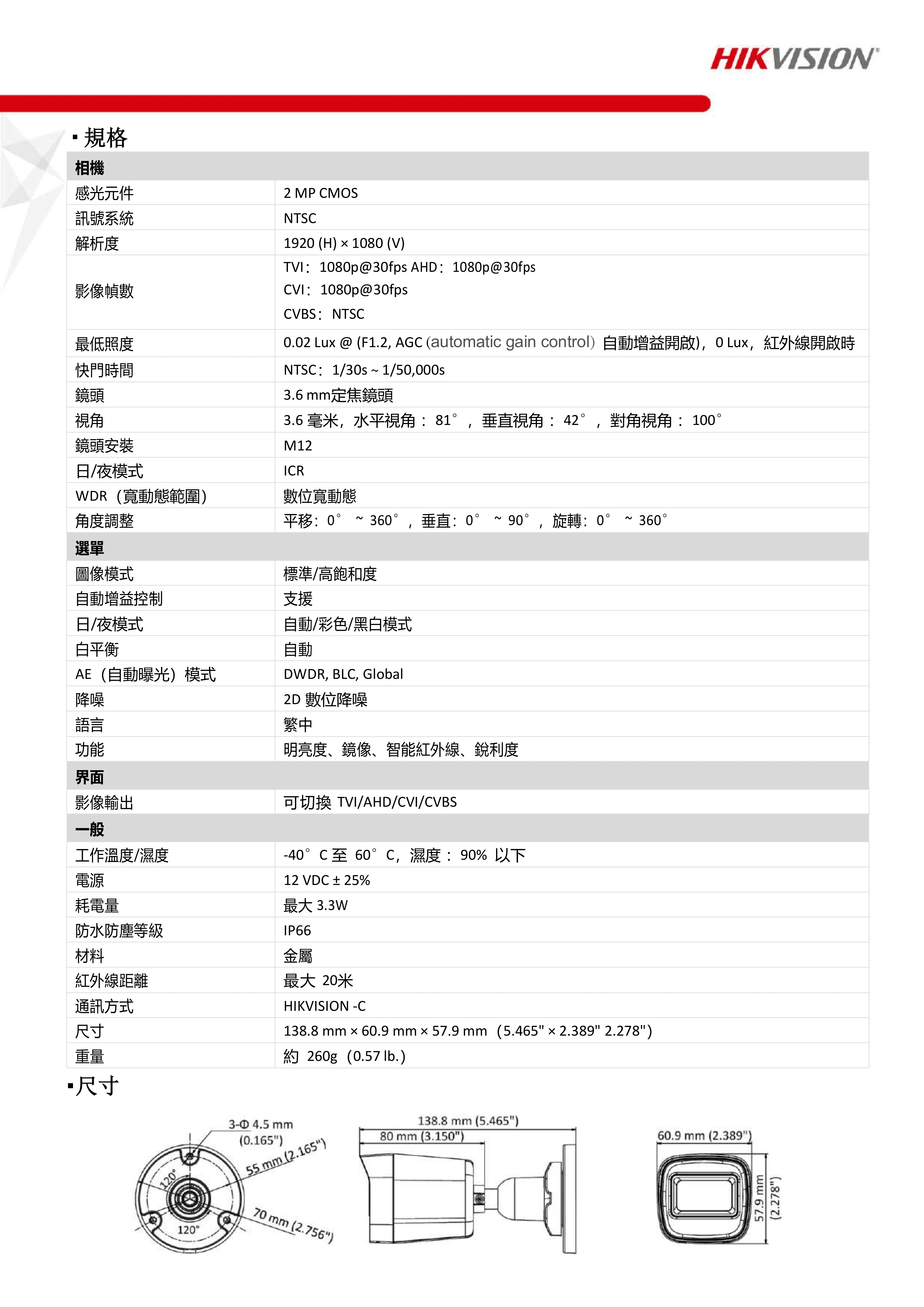 *型號:DS-2CE16D0T-EXIF 2MP高清小管