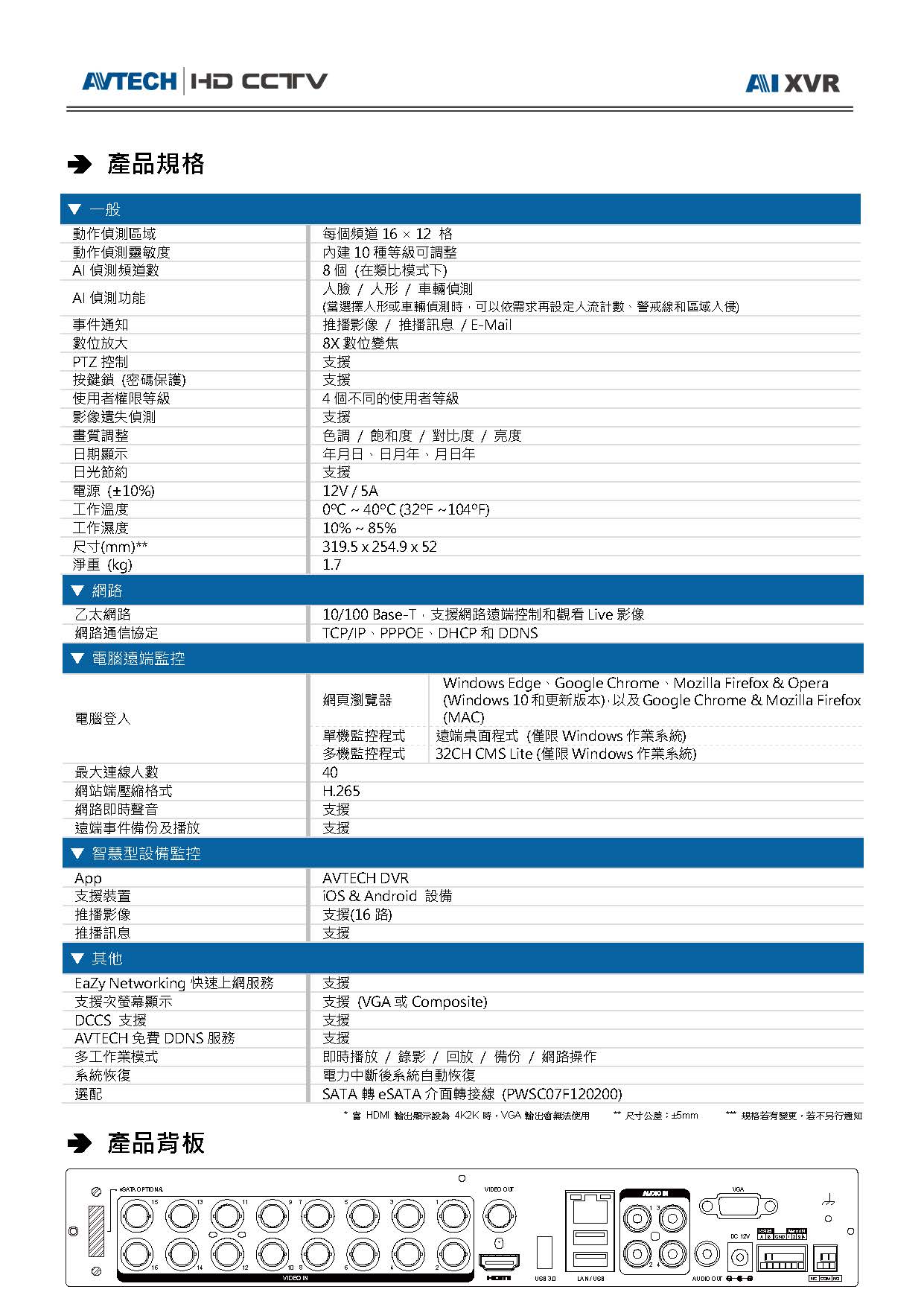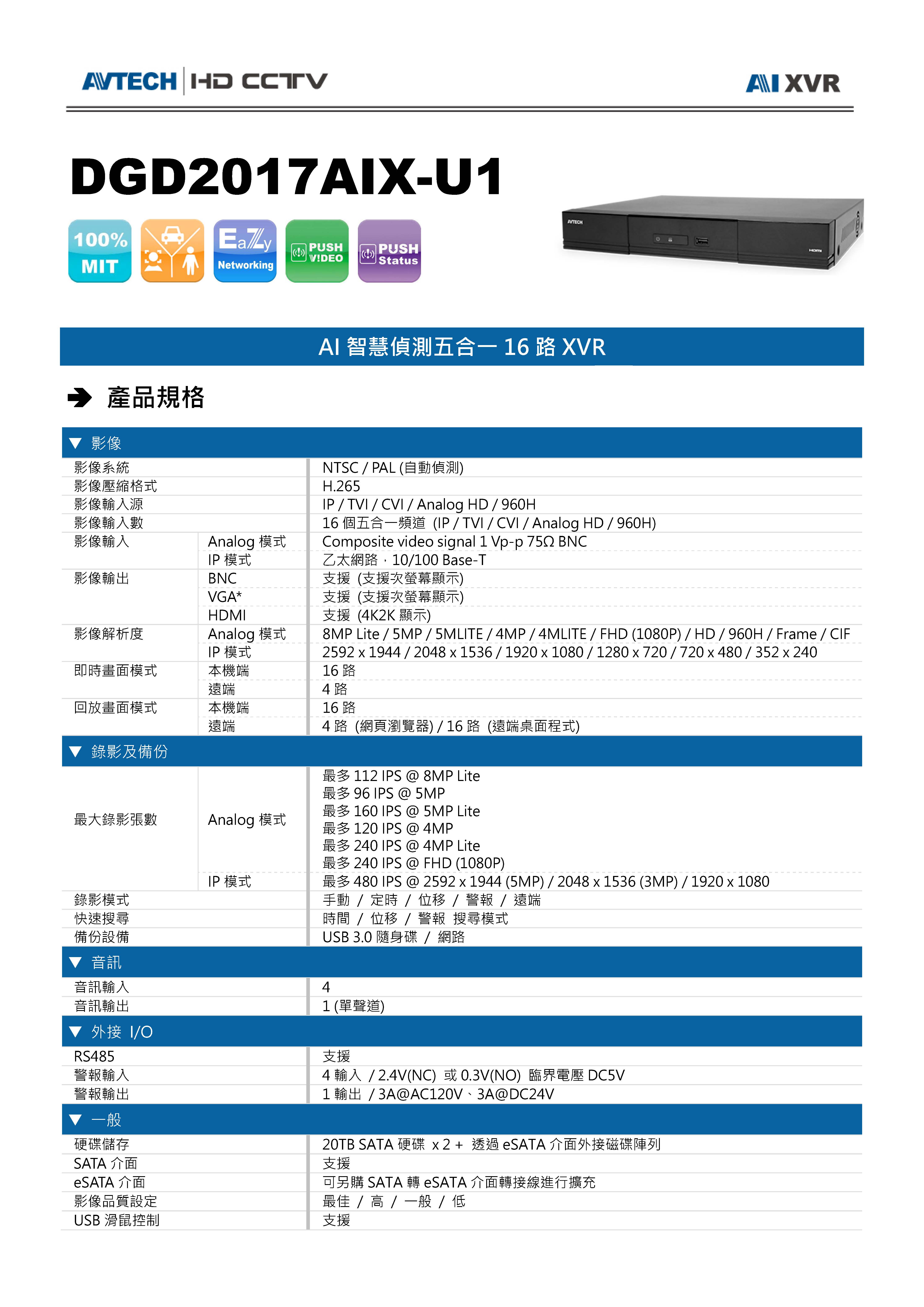 AVTECH 陞泰 16路 AI XVR 五合一錄影主機 (支援8路AI) DGD2017AIX-U1