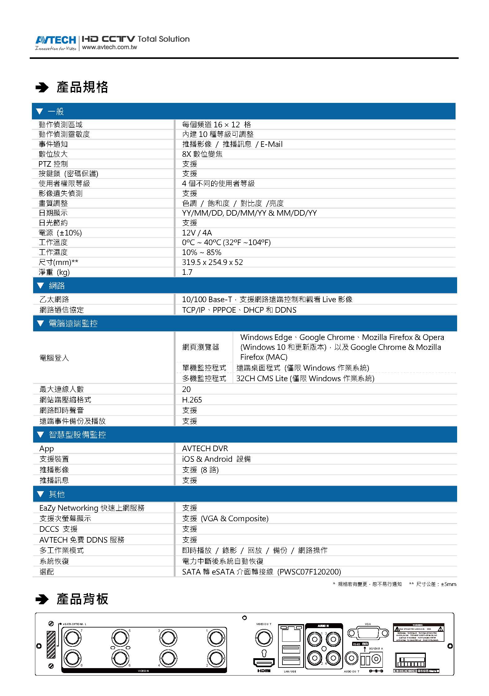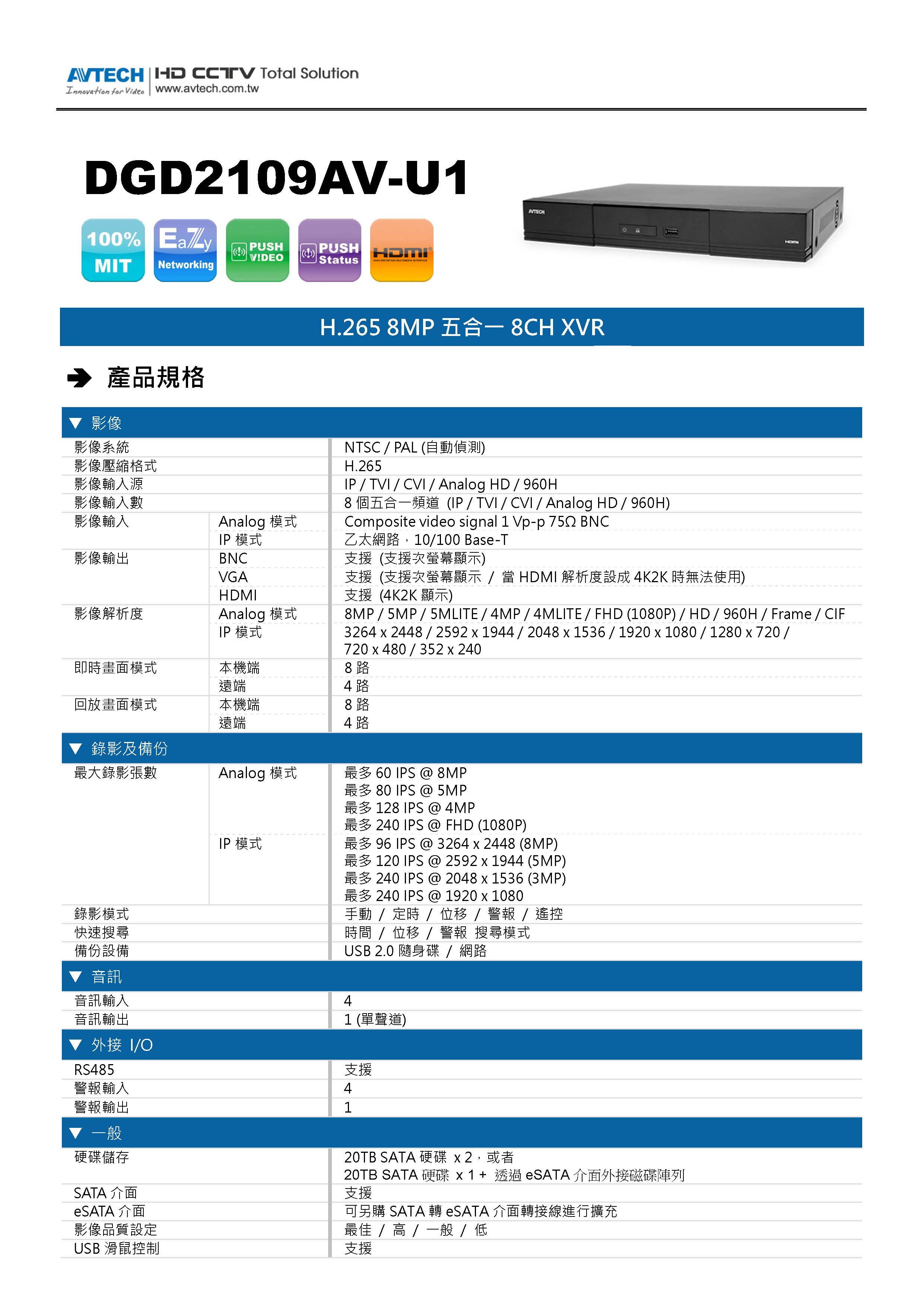 AVTECH 陞泰 8路 800萬 XVR 五合一錄影主機 DGD2109AV-U1
