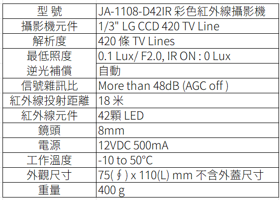 JYAN 彩色紅外線類比攝影機 LG晶片 8mm JA-1108-D42IR